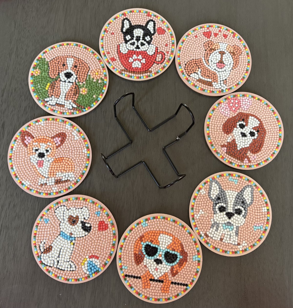 Set of 8 assorted dog Diamond Art coasters on a peach background to protect your tables from drips and condensation on cups and glasses. Includes holder to keep coasters stacked neatly.