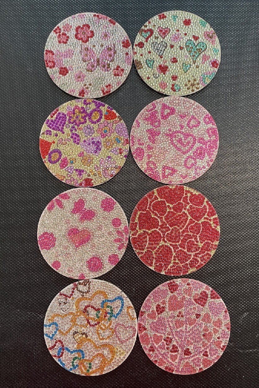 Adorable Heart Diamond Art Coasters to protect your tables from drips and condensation on cups and glasses. Includes holder to keep coasters stacked neatly.