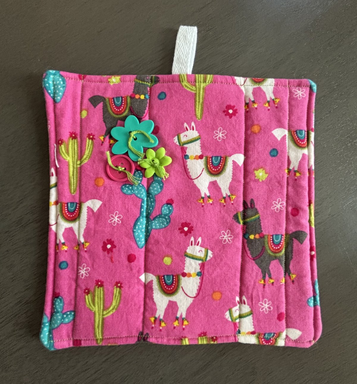 Adorable pink, Fiesta Llama pot holder. 8” square