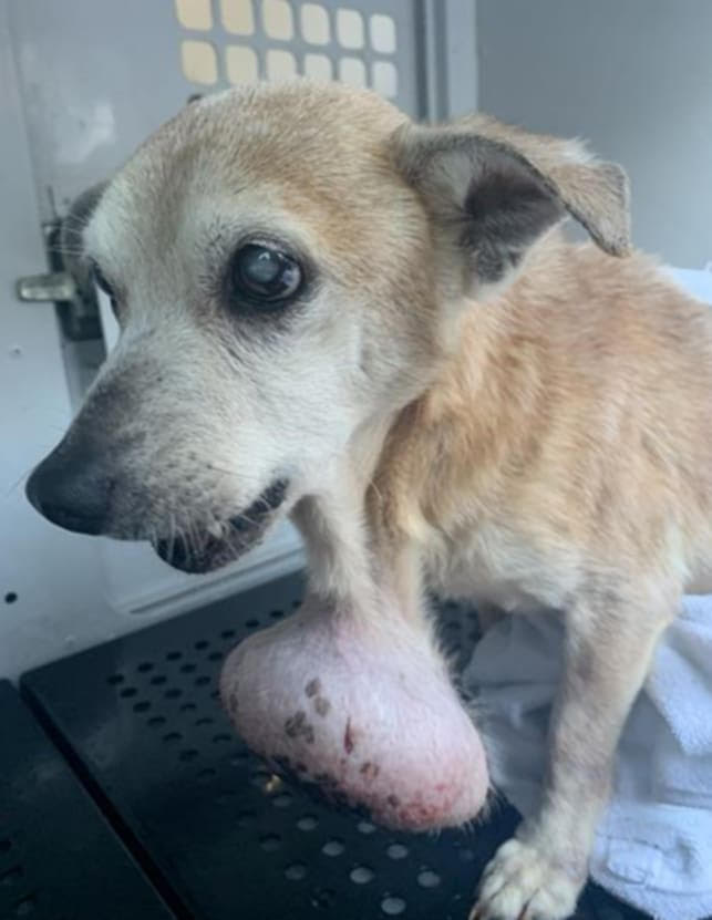 Mr. Pillows, a 13-year-old Chihuahua mix weighing about 14 pounds. Recently, Heidi’s Legacy Dog Rescue saved Mr. Pillows from the Pet Resource Center in Tampa, where he had been found as a stray, suffering from a massive, fist-sized growth hanging from his neck.