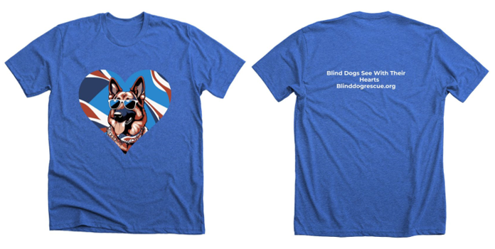 We're so excited to share our newest t-shirts, with various fun  colors! The design on the left is on the front of the shirts, and "Blind Dogs See With Their Hearts" is on the back. The design on the right is blank on the back.  This is an ongoing fundraiser with no end date, perfect for July 4th, Veterans Day, etc.  You choose the color and style.  Happy shopping! orders are printed within 2 days