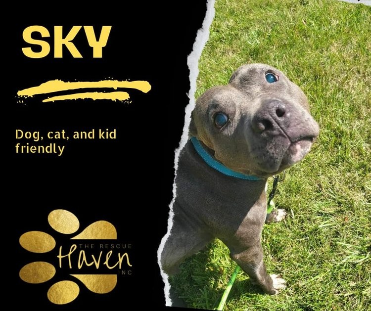 Sky is BLIND. She is friendly with proper introduction.  She may do better with older dogs and older children because of her disability. Cats are unknown but we don’t think she would have any issues. She is spayed, crate and potty trained. She has been in our care since July of 2024.